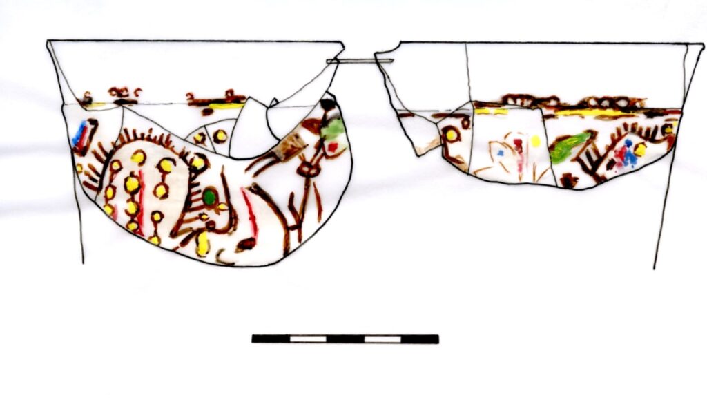 A Rév utca 4. számú telek területén folytatott kutatások során két késő középkori kőépület mellett, a külső udvarszintbe mélyítve több, a 14. század első felére keltezhető szemétgödör is előbukkant. A gödrök betöltésében a konyhai, illetve asztali kerámiaedények mellett nagyobb számú öntőtégely, pénzérmék, vas tőr, csont játékkockák-és zsetonok, számszeríjdió, ruhadíszek, övcsatok és egyéb használati tárgyak, illetve kisleletek mellett jelentékeny számú üvegtöredék is volt. A gondos restaurálás során derült ki, hogy a leletegyüttes változatos formagazdagságú, több különböző típusba sorolható üvegpoharat, csészét és palackot egyaránt tartalmazott.